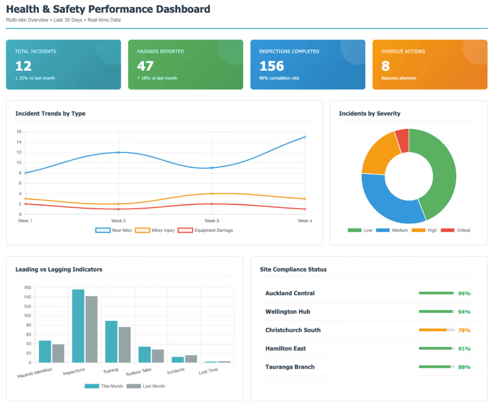 Available as an optional add-on to your ThinkSafe membership. Most businesses don’t need this — the standard dashboard handles day-to-day operations. This is for multi-site organisations, board reporting, and strategic analytics.